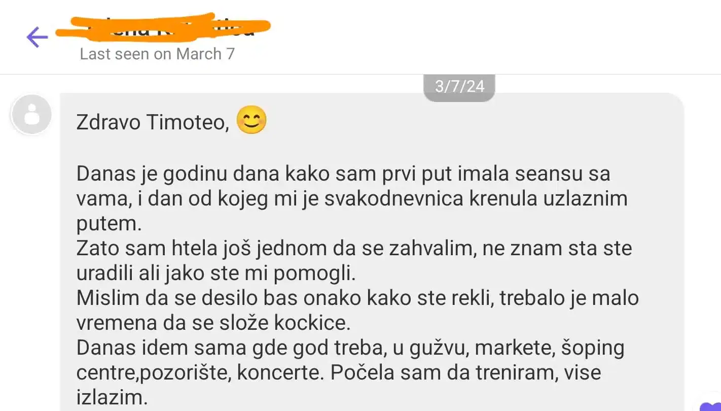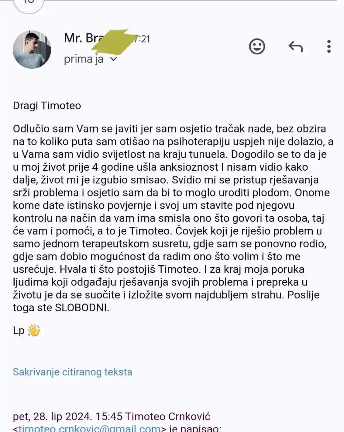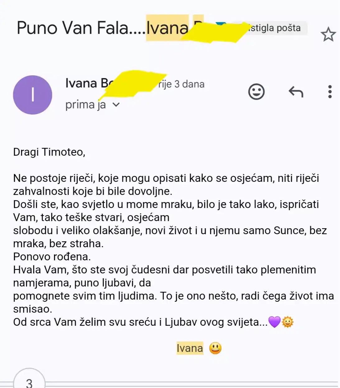 Više od 27 privatnih poruka zahvale upućenih Timoteu dokaz su učinkovitosti, ali i trajnosti rezultata proizašlih iz terapije brze transformacije. Pregledajte ih u nastavku.